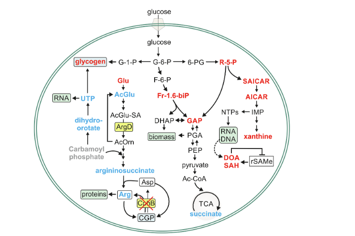 The Algatech team discovered that deleting the cphB gene completely blocks light-activated heterotrophic growth. To uncover the metabolic basis of this phenotype, our laboratory contributed targeted LC-HRMS metabolomics, which showed that CphB is essential for activating arginine biosynthesis and for maintaining a balanced carbon–nitrogen and nucleotide metabolism during the transition from photosynthesis to heterotrophy.