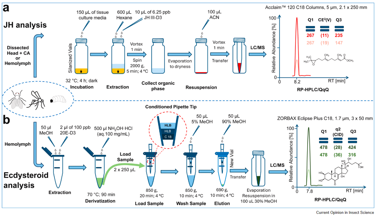 The review summarizes current mass-spectrometric approaches for highly sensitive detection of JHs and ecdysteroids, including validated LC-MS/MS workflows capable of quantifying hormone titers from minimal biological material. It also outlines contemporary chemical, genetic, and molecular tools that enable targeted enhancement or suppression of endocrine signaling, from synthetic agonists to CRISPR-based gene knockouts.